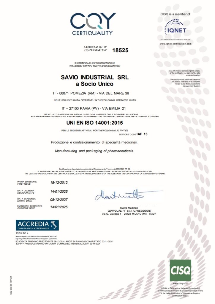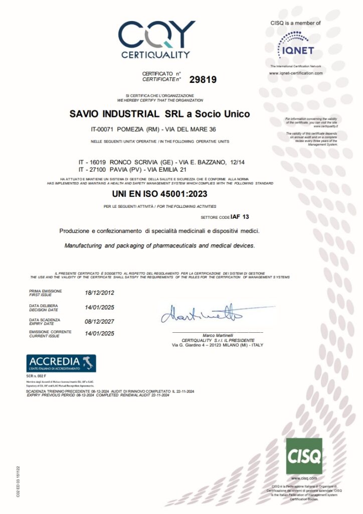 Il Gruppo Savio si adopera per promuovere il benessere, fisico e mentale delle sue persone, operando sempre nel massimo grado di sicurezza possibile e di rispetto dell’ambiente. Entrambi i nostri siti produttivi Savio Industrial si impegnano ad adempiere a tutte le leggi e norme vigenti in materia nonché agli standard necessari a fornire un’adeguata tutela delle norme ISO 45001:2018 (per lo stabilimento di Pavia e Ronco Scrivia) e ISO 14001:2015 (per lo stabilimento di Pavia).
