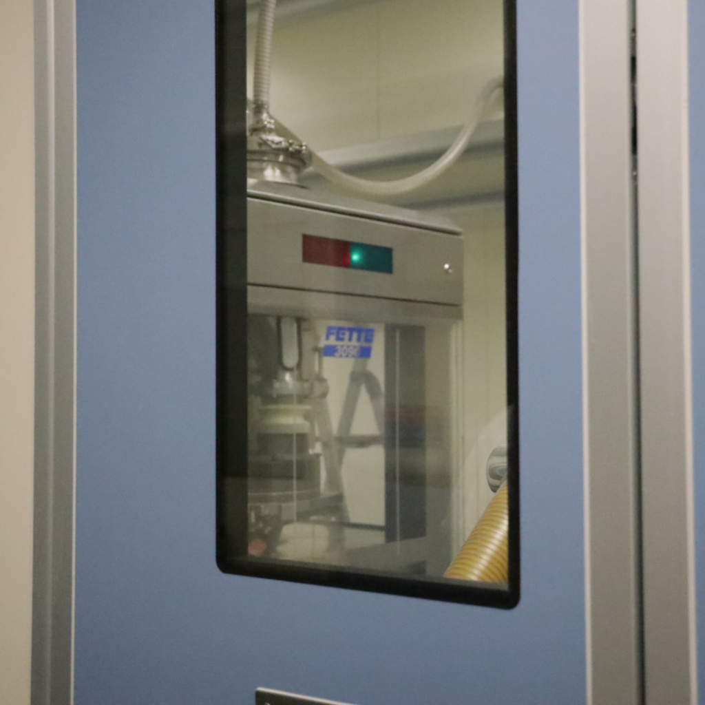 Tutte le comprimitrici sono installate all’ interno di box dedicati e equipaggiati con partizioni farmaceutiche di separazione tra locale macchina e locale operatore, che consentono di ridurre al minimo il contatto diretto del personale con il prodotto unitamente ad una riduzione della polverosità e della rumorosità dell’ambiente di lavoro.