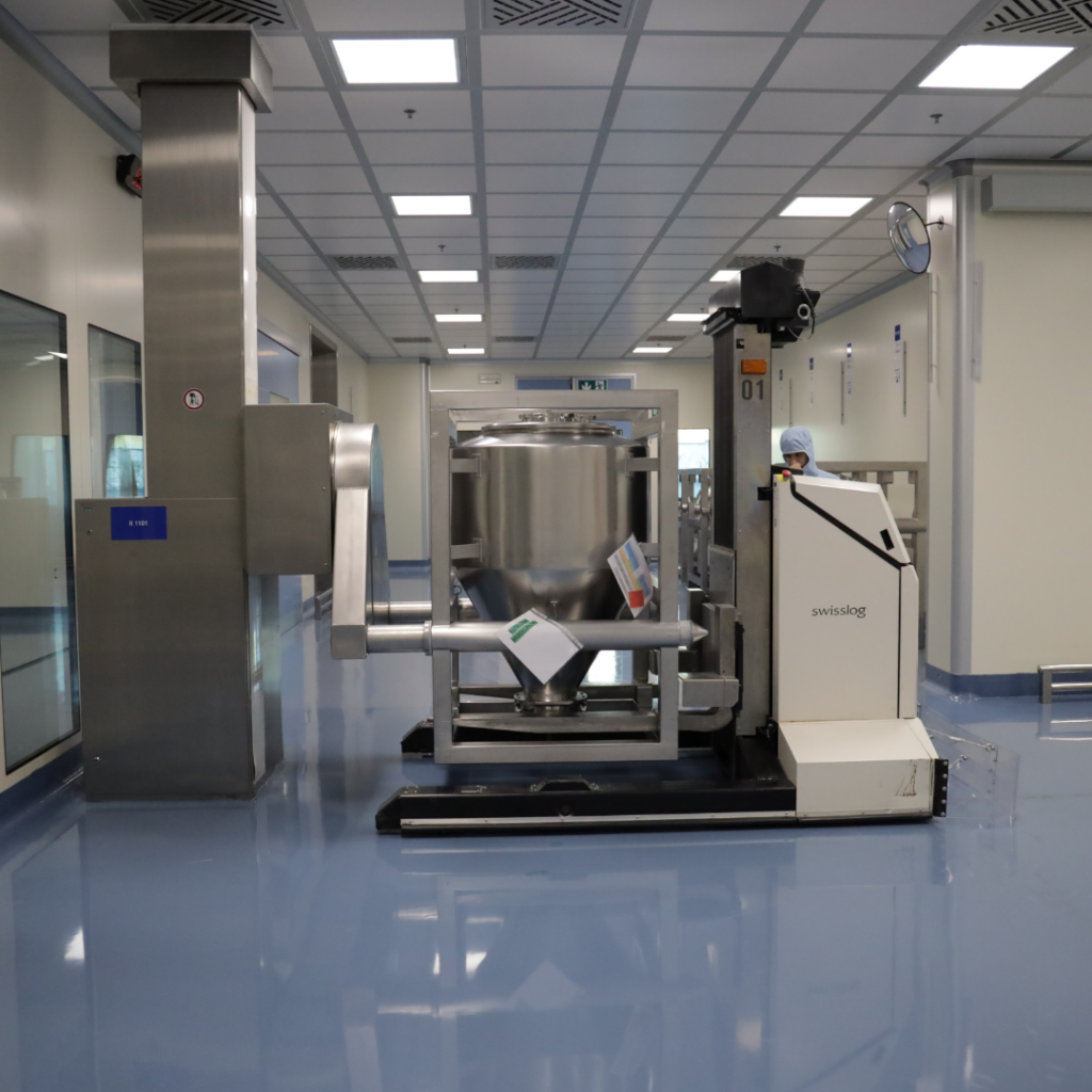 Completata l’aggiunta delle materie prime in IBC, in base alle ricette approvate contenute nel sistema di dispensazione, i lotti/sottolotti in essi contenuti possono essere spostati nelle successive aree di processo mediante l’uso di due veicoli a guida laser (AGV).