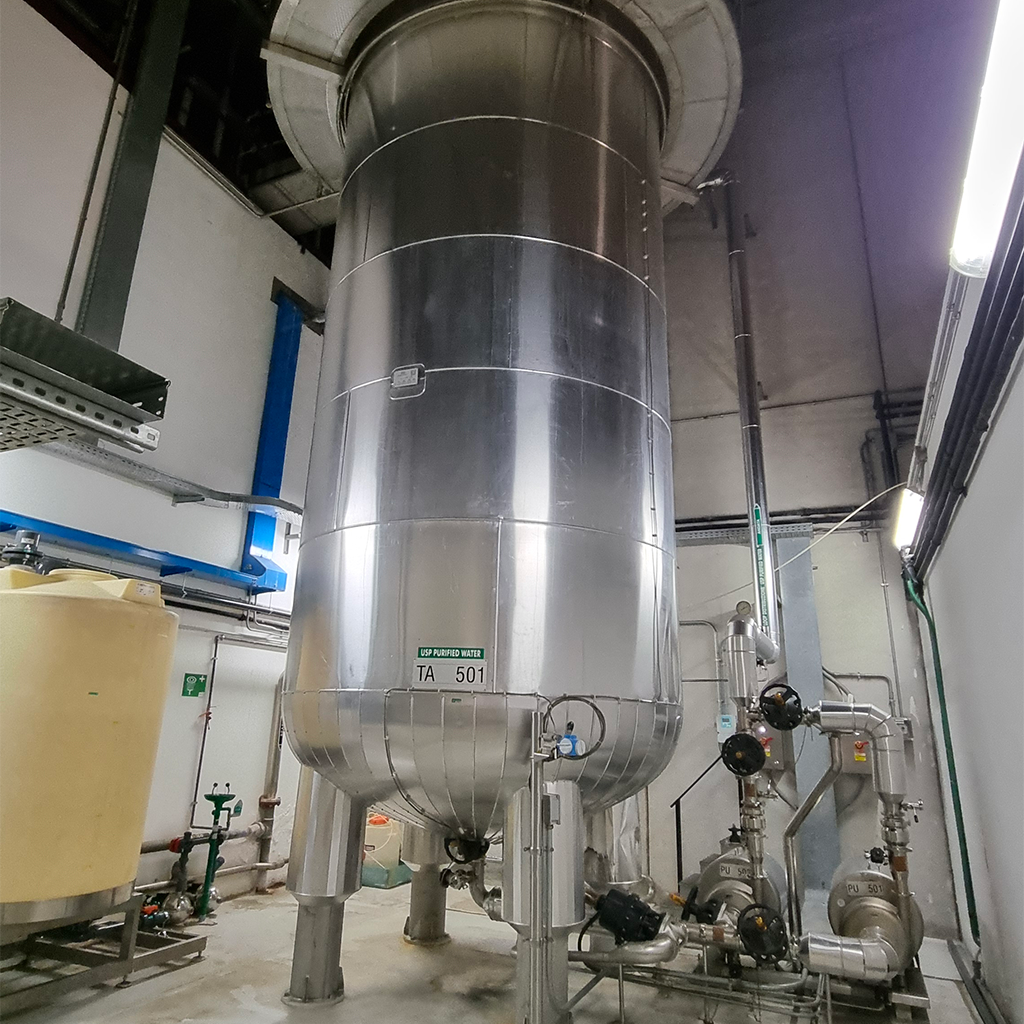 L’impianto di produzione di acqua purificata con sistema di supervisione Rockwell / Auteco fornisce acqua conforme ai requisiti EP/USP per Purified Water mediante un loop caldo sanificato in continuo a 80°C per l’unità di produzione 2 e un loop a temperatura ambiente per la rimanente porzione dello stabilimento, sanificato settimanalmente.